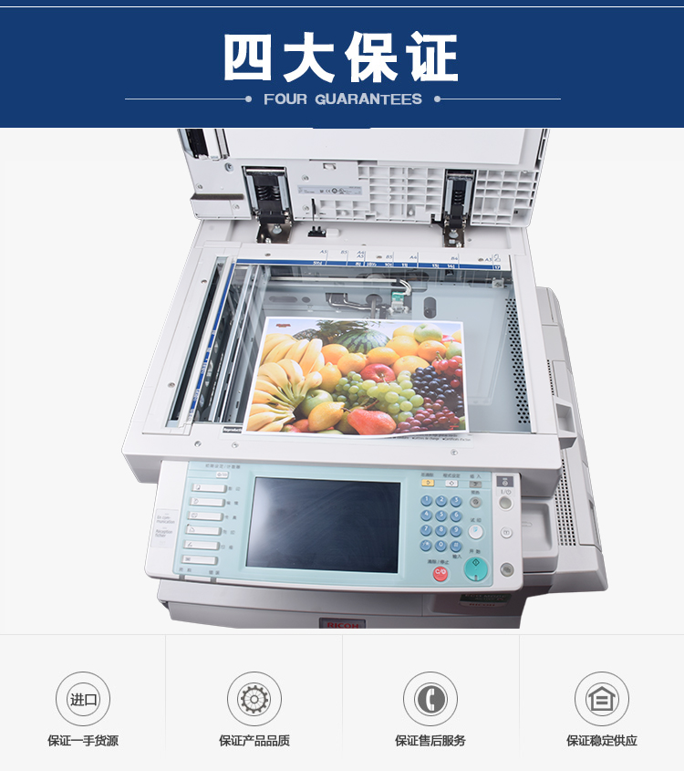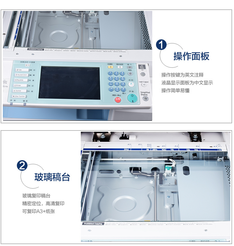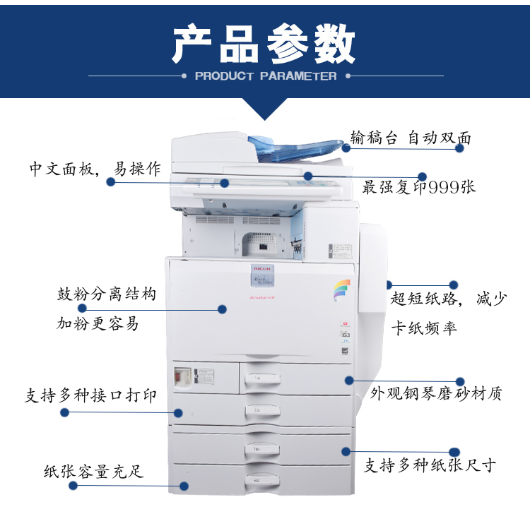 描述:数码复合机:涵盖功能:打印/复印/扫描/传真。分辨率:1200*1200dpi。复印比例:25-400%。理光Aficio MP C3300数码复合机:特性:原稿类型:纸张书籍物体。