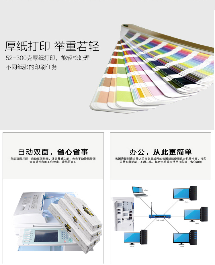功能:标配4纸盒/彩色双面网络复印/打印/扫描