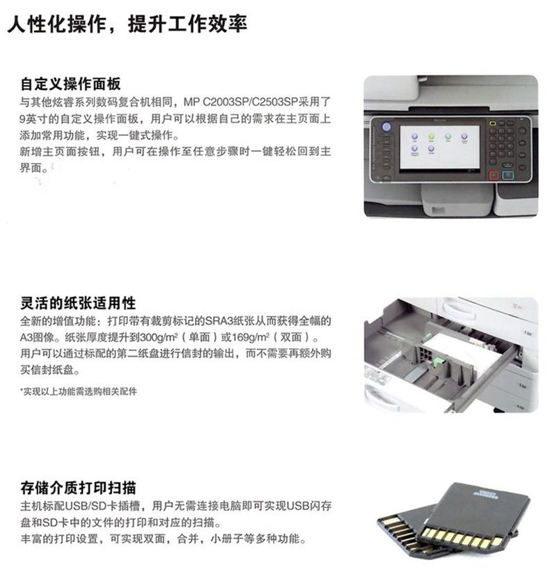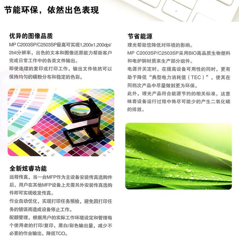 描述:最新款上市机型,比老款C2051处理速度提高,卡纸率降低,是一款同级别机型中佼佼者!理光MP C2003SP商务彩色多功能数码复合机,集彩色复印、网络打印、多样扫描、无纸传真及存储发送等多种功能于一体,以高效的生产力,高品质的全彩图象和人性化的功能设计满足办公用户各种纷繁复杂的工作需求,是彩色办公的新一代理想之选.