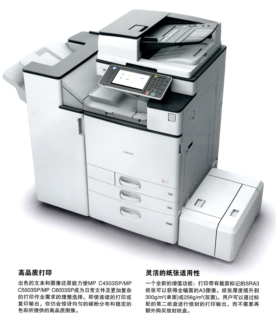描述:(理光办公型高端彩色一体机性能卓越!办公高效!) 打印分辨率提升到1200x1200dpi/2bit 最大可支持SRA3(320x450mm)尺寸纸张输出双面纸张重量可达256g/m2 标配信封供纸盘包括内置装订器在内的更多全新选购件送稿器供纸能力进一步改善(ARDF扩展到100页,SPDF扩展到220页)海报打印功能可实现无书钉小册子折叠。